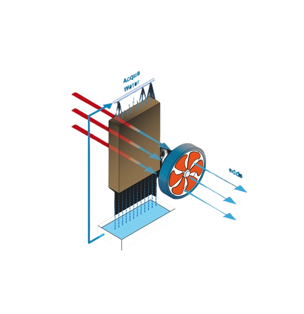 Un sistema di controllo aziona la pompa dell’acqua per bagnare uniformemente il pannello in tutta la sua superfice; Il ventilatore interno aspira l’aria calda che, attraversando il pannello così bagnato fa evaporare l’acqua e la raffresca per poi diffonderla nell’ambiente.